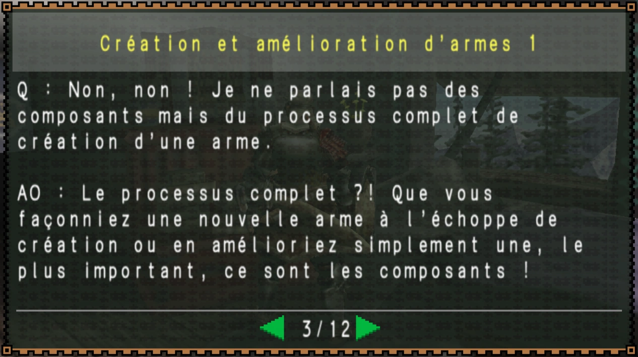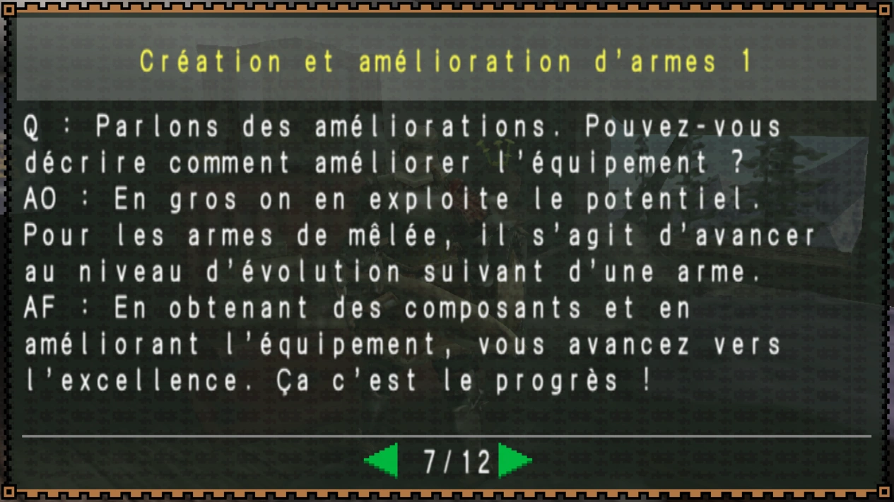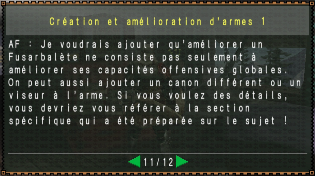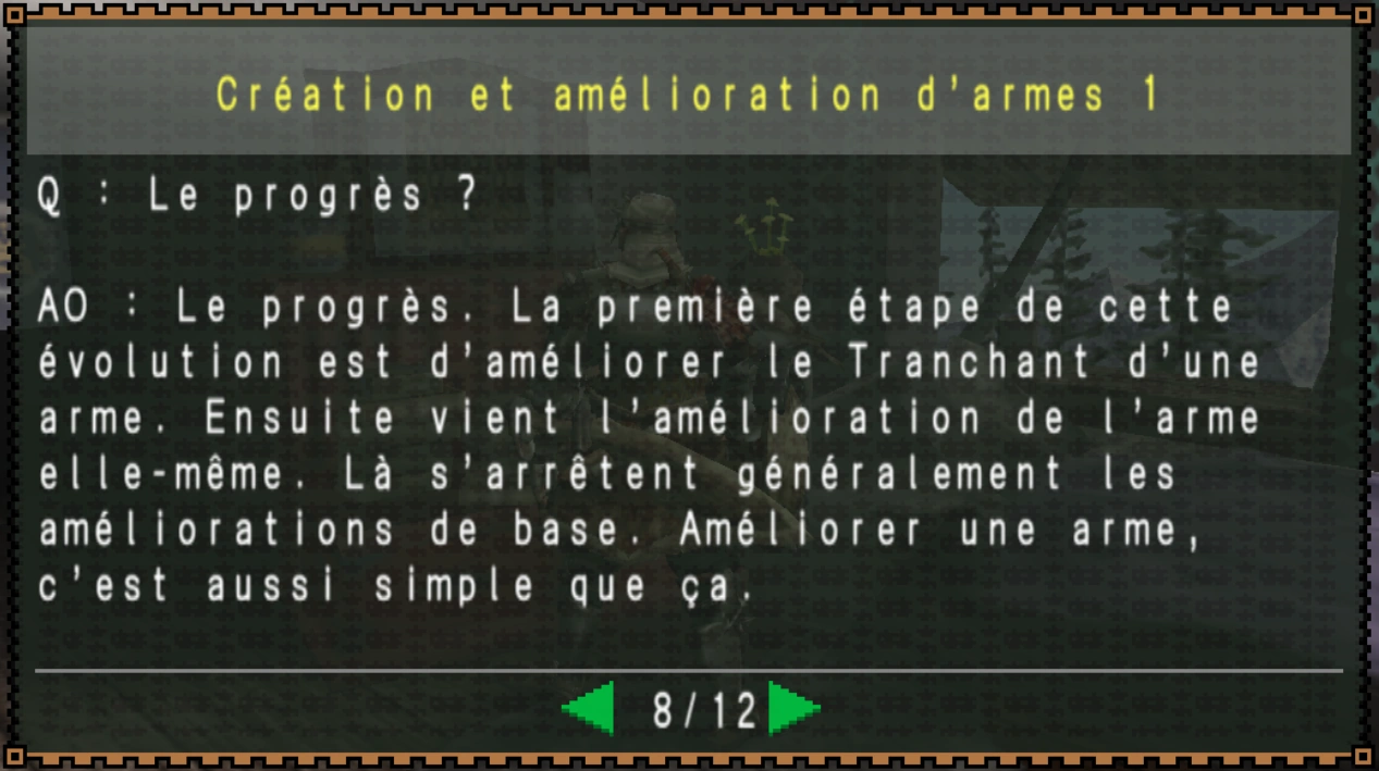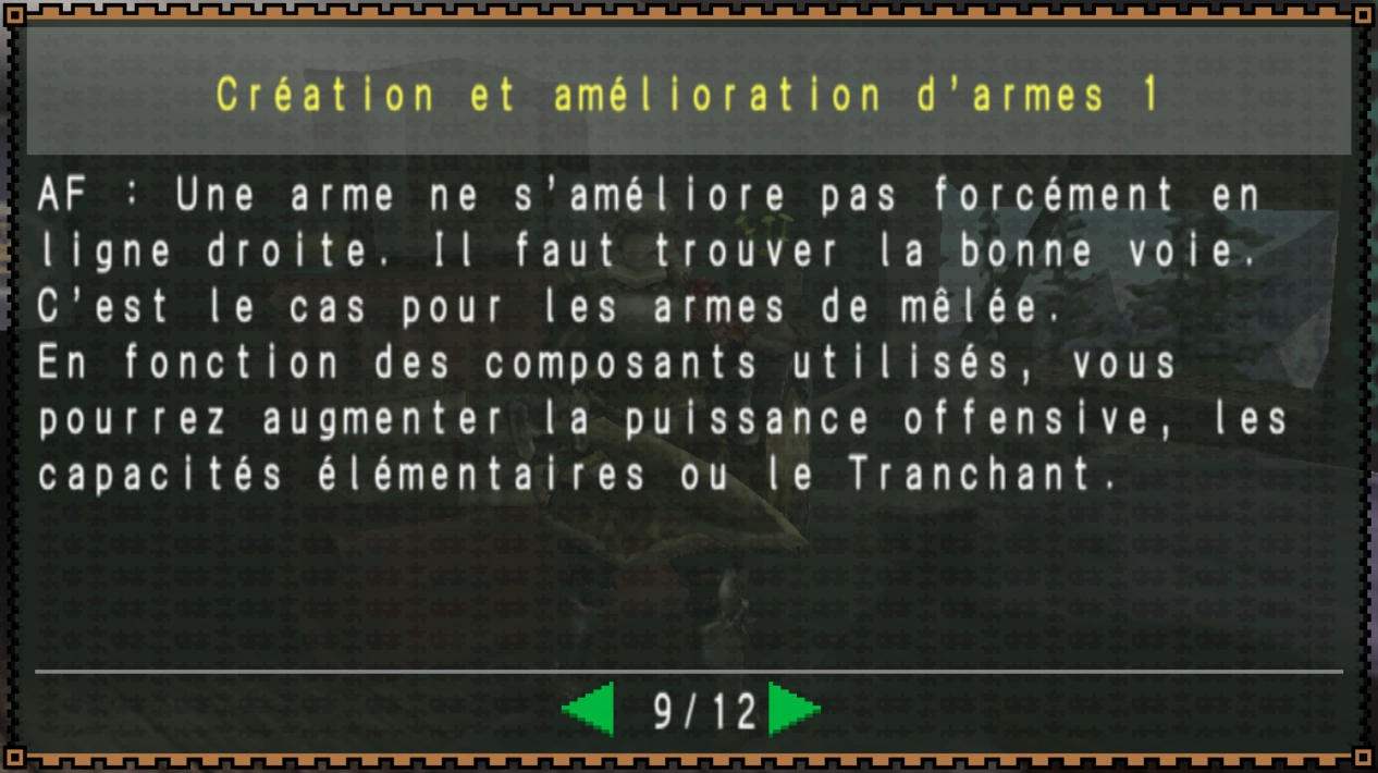 Cette page concerne les premières informations publiées dans la bibliothèque de Monster Hunter Freedom Unite sur la création et l'amélioration des armes.