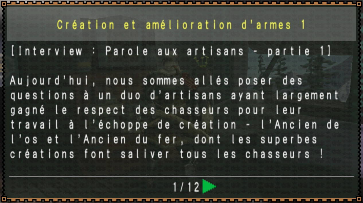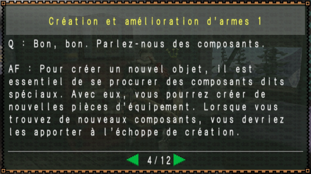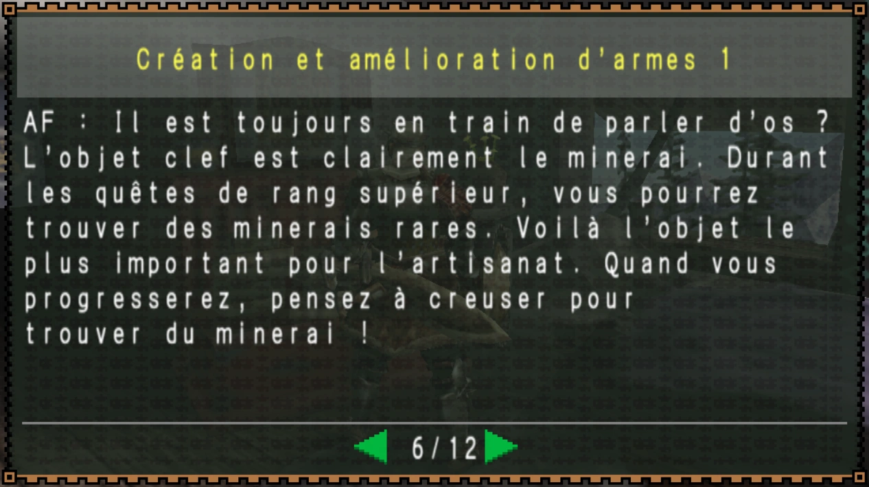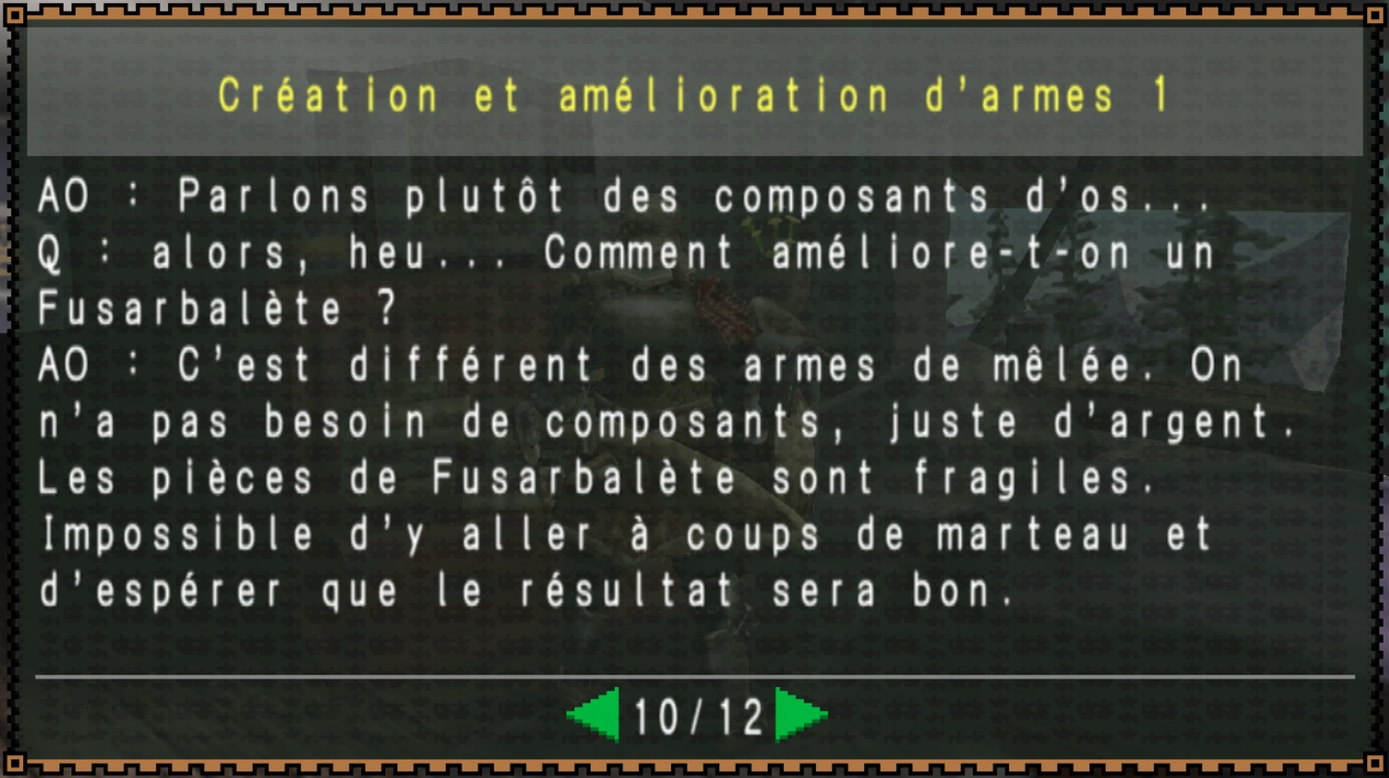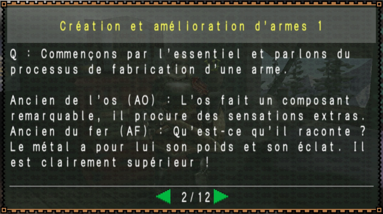Cette page concerne les premières informations publiées dans la bibliothèque de Monster Hunter Freedom Unite sur la création et l'amélioration des armes.