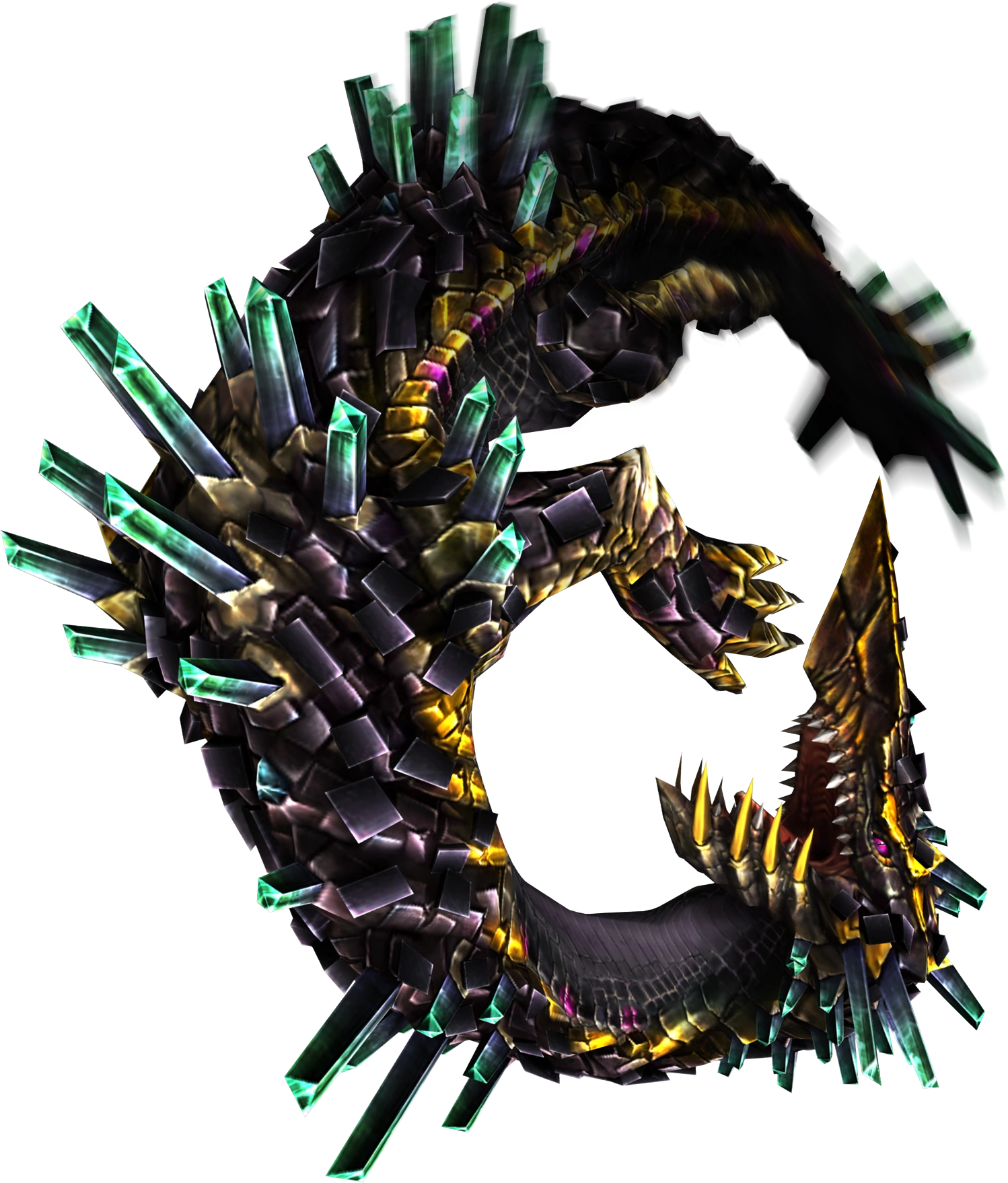 | クアルセプスは海竜種に属し、幼生時には海で過ごし、成体になると獲物を求めて陸へと住処を移すため海竜種でありながら陸棲となる風変わりな竜である。背中に生えた水晶から“晶竜”の異名を持つ。 | |