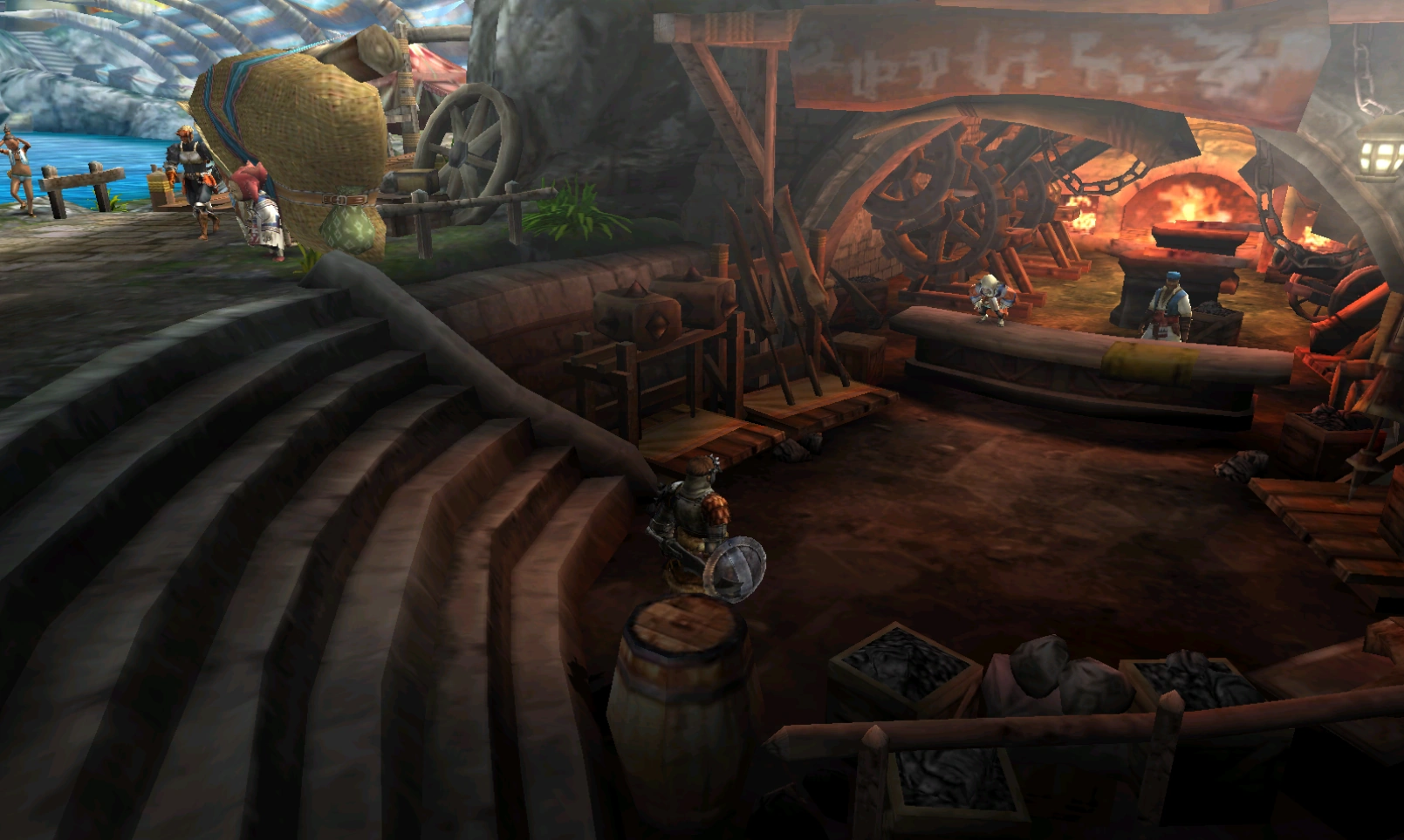 Endroit où les chasseurs forgeront leurs armes, armures et décorations à gauche ainsi qu'acheter et vendre des armes, armures et décorations à droite.
